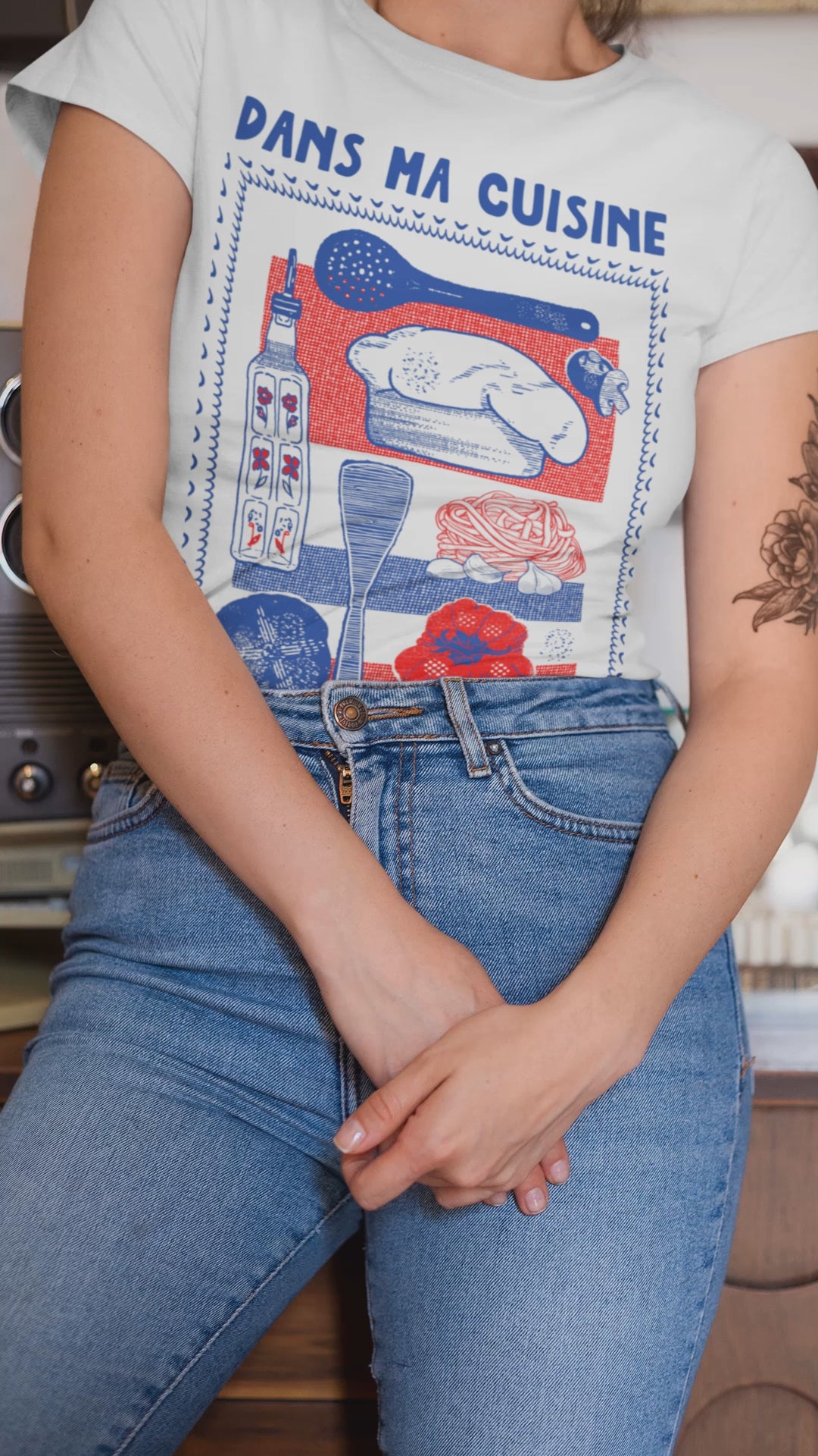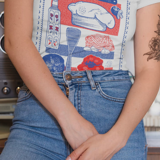 Die französische Küche hat Dein Herz erobert? Mit liebevoll gestalteten Illustrationen von Kochlöffeln, Kochmütze, saftiger Tomate, aromatischem Knoblauch, verführerischen Nudeln und knusprigem Brot bringt dieses Design das Savoir-vivre direkt in Deinen Kleiderschrank.