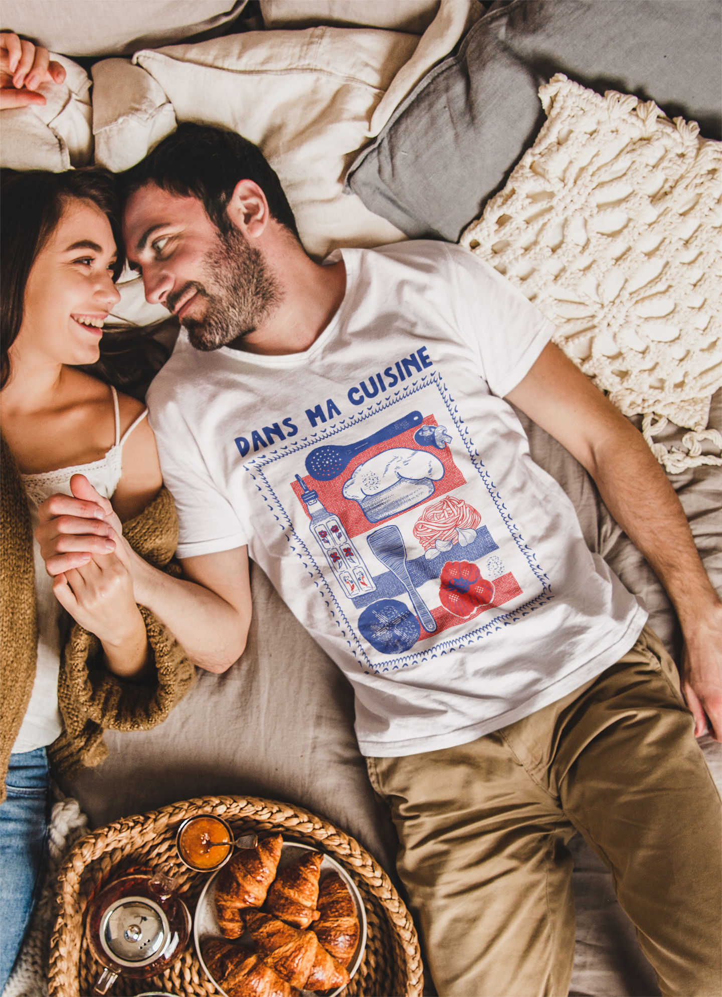 Die französische Küche hat Dein Herz erobert? Mit liebevoll gestalteten Illustrationen von Kochlöffeln, Kochmütze, saftiger Tomate, aromatischem Knoblauch, verführerischen Nudeln und knusprigem Brot bringt dieses Design das Savoir-vivre direkt in Deinen Kleiderschrank.